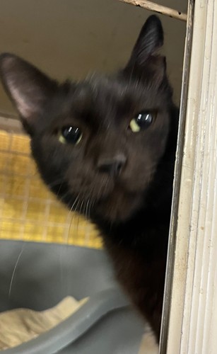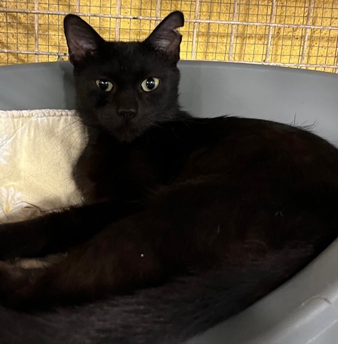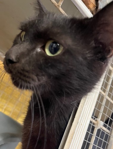 Gentille petite chatte noire. Age à déterminer. Chat FIV+ (transmissible entre chats seulement, ne peut vivre avec un autre chat ou alors avec un chat FIV+, chat plutôt à maintenir à l'intérieur pour éviter de contaminer les chats alentour).
